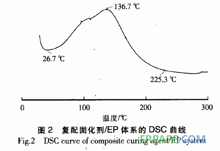 由圖2可知:復配固化~I]/EP共混體系只有1個明顯的放熱峰,說明兩者在固化過程中的協調性良好;固化體系的起始反應溫度(25℃左右)較低,表明常溫可凝膠;固化體系的放熱峰頂溫度為136.7℃,反應終點溫度為225℃左右,表明該復配固化劑可滿足與中溫、高溫EP預浸料共固化的成型條件。