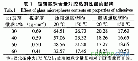 在其他條件保持不變的前提下,玻璃微珠含量對低密度糊狀膠粘劑性能的影響如表1所示。由表1可知:玻璃微珠含量越多,低密度糊狀膠粘劑的視密度、剪切強度(常溫、高溫)和壓縮強度(常溫、高溫)均呈下降態勢。