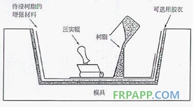依次在模具表面上施加脫模劑 、膠衣、一層粘度為0.3-0.4PaS的中等活性液體熱固性樹脂(須待膠衣凝結后)、一層纖維增強材料,纖維增強材料有表面氈、無捻粗紗布(方格布)等幾種。以手持輥子或刷子使樹脂浸漬纖維增強材料,并驅除氣泡,壓實基層。鋪層操作反復多次,直到達到制品的設計厚度。 樹脂因聚合反應,常溫固化,可加熱加速固化。