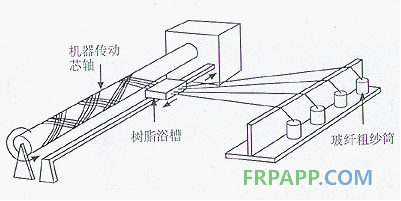 通常采用直接無捻粗紗作為增強材料。粗紗排列在紗架上。粗紗自紗架上退繞,通過張力系統、樹脂槽、繞絲嘴,由小車帶動其往復移動并纏繞在回轉的芯軸(模)上。纖維纏繞角度與纖維排列密度根據強度設計,并由芯軸(模)轉速與小車往復速度之比,精確地控制。固化后將纏繞的復合材料制品脫模。