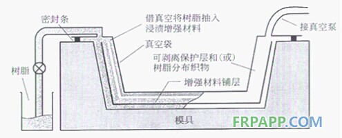 此法是手糊法與噴射法的延伸。將手糊或噴射好的積層在樹脂的A階段與模具在一 起,在積層上覆以橡膠袋,周邊密封,在后用真空泵抽真空,使積層受到不大于1個氣壓的壓力,而被壓實、固化、成型。