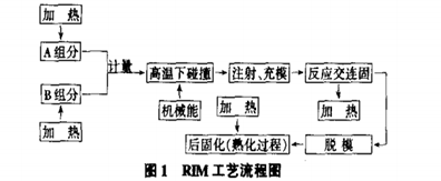 反應注射成型,簡稱RIM( Reaction Injection Molding),是將兩種或兩種以上具有反應性的液體組分在一定溫度下注入模具型腔內,在其中直接生成聚合物的成型技術。即將聚合與成型加工一體化,或者說,直接從單體得到制品的“ 一步法注射技術”。和傳統的熱塑性注射成型 (TIM)不同,RIM是單體在模具中聚合而形成固體聚合物,而TIM是聚合物在模具中冷卻才成型。其它反應成型加工方法,如單體澆鑄成型、熱固性塑料的注射成型,雖然也是在形成部件的形狀后完成聚合反應。而在RIM中,單體和模具的溫度沒有很大的不同,而是靠基體激烈撞擊混合來活化反應。和各種聚合物加工方法相比RIM制品最節能,RIM是目前聚合物加工領域中引人注目的新方向。
