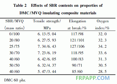 從表1 可以看出,用SBR 作相容劑,DMC /MVQ 的各項性能最優,其次是EPDM。由于NBR與MVQ 的相容性不好,制得的試樣分層,無法成樣,無法得到測試數據; 采用BR、ACR 作相容劑,試樣的各項性能比較接近,且力學性能較差。產生上述結果的原因是: MVQ 與SBR 都為非極性橡膠,根據相似相容原理,二者可以很好地結合在一起; 其次是MVQ 的相對分子質量較小,而SBR的相對分子質量較大,而且支鏈多,分子間空隙大,二者可以很好地相容,從而提高了MVQ 的性能。另外從表1 還可以看出,SBR 與MVQ 并用氧指數較高,所以在所考察的橡膠中選擇SBR 作相容劑,制得的絕緣材料的綜合性能較好。