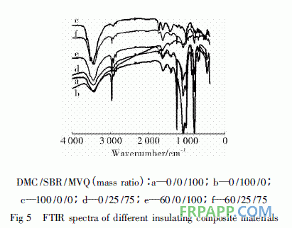 由圖5 可以看出,DMC /SBR/MVQ 的曲線f保留了CH2 2 920 cm - 1、C C 1 630 cm - 1、CH3— 1 430 cm - 1 處的振動峰,硅橡膠與白炭黑間所形成的Si—O 1 131 cm - 1 處的特征峰; 曲線f與曲線a 比較,在Si—O 1 131 cm - 1處的特征峰更加明顯,說明試樣中有橡膠和玻璃纖維交聯鍵生成; 同時曲線f 在1 730 cm - 1和1 020 cm - 1處出現了新的—CO—和—C—O—C—特征峰,C O 特征峰是由于DMC 中的不飽和聚酯產生,而C—O—C—特征峰是由不飽和聚酯和SBR 雙鍵交聯所致。