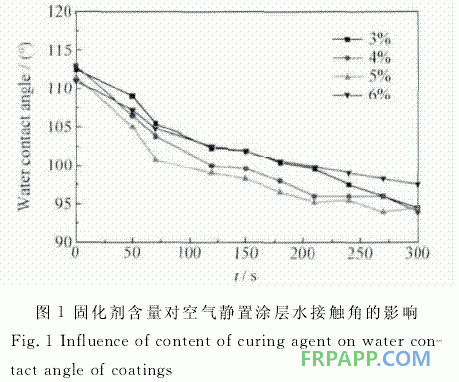 固化劑添加量改變,對空氣靜置處理后的涂層接觸角初始值和五分鐘內下降速率影響不大,如圖1所示;而海水浸泡樣本中固化劑的添加量為3%、4%、6%的樣本的初始接觸角較大,五分鐘后仍維持較大的接觸角。固化劑添加量為5%的樣本接觸角初始值小且隨時間延長迅速下降,如圖2。
