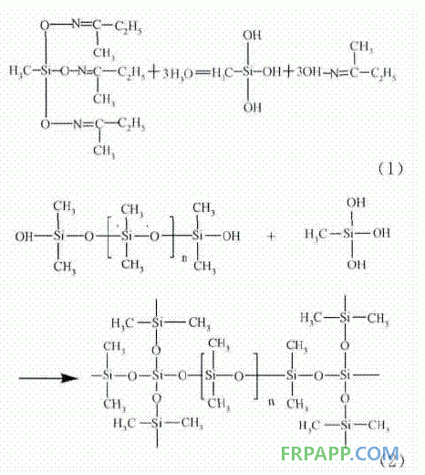 固化機理:涂料中的固化劑甲基三丁酮肟基硅烷(D31)暴露在空氣中時,與空氣中的水發生水解反應生成硅醇CH3Si(OH)3,如式(1);而硅醇與聚二甲基硅氧烷進一步發生交聯縮聚反應,形成網絡交聯結構的有機硅樹脂,如式(2)。