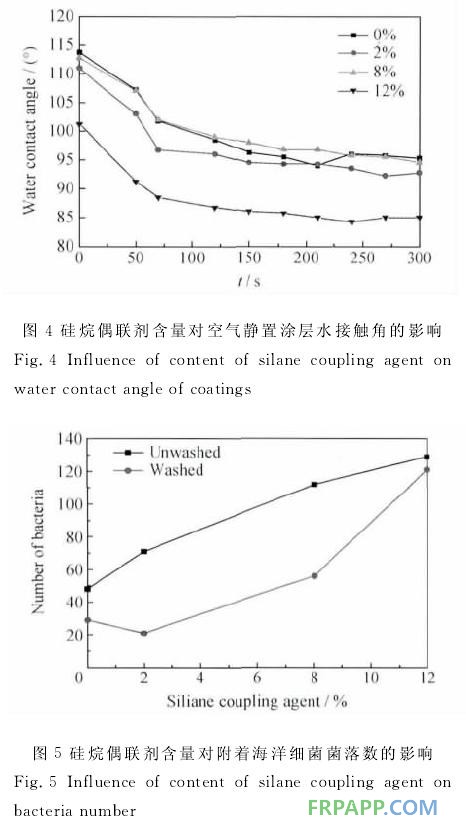 (3)過高的固化劑添加量會導致硅氧鏈的交聯程度增加,網狀結構變密,增加涂層的硬度,不利于涂層的防污性能;過高的硅烷偶聯劑添加量會導致涂層表面的親水基團增多,水接觸角降低,海洋細菌附著增加。