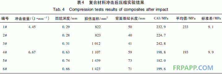 從C 掃圖中可以看出,隨著沖擊能量從4. 45J /mm 增加到6. 67 J /mm,復合材料試樣的凹坑深度、損傷面積及背面裂紋長度都有明顯的提高,復合材料壓縮強度則有一定程度的下降。對航空級復合材料,一般用沖擊后剩余壓縮強度( CAI) 來度量復合材料體系的韌性,在NASA 標準文件中,通過CAI 對復合材料進行了分類或劃代[6]: 脆性復合材料的CAI 一般低于138 MPa; 弱韌化改性樹脂基復合材料的CAI 值大約為138 ~ 192 MPa; 韌性樹脂基復合材料的CAI 值大約為193 ~ 255 MPa; 高韌性樹脂基復合材料的CAI 值一般應高于256 MPa。