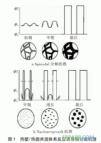 研究表明,對于初始均相的熱塑/熱固共混樹脂體系,在熱固性樹脂固化交聯的過程中,將發生反應誘導分相[6]。典型的熱塑/熱固共混固化體系的分相機理包括Spinodal 分相機理與Nuclear -growth 機理( 見圖1) 。