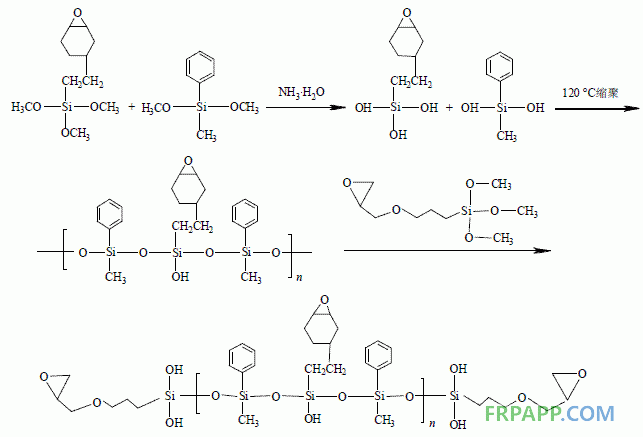有機硅單體和含環氧的有機硅單體通過水解、縮聚等反應,在有機硅分子上引入環氧基團,生成環氧–苯基甲基有機硅共聚物。反應過程如下: