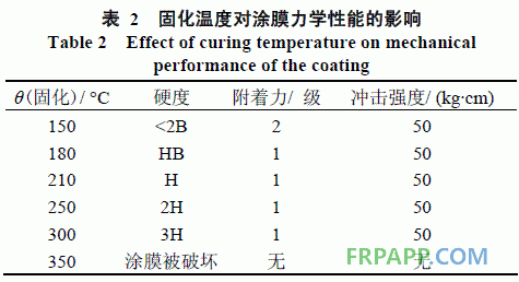 在150 ~ 300 °C 溫度范圍內分別對涂膜進行固化,探討固化溫度對涂膜性能的影響,實驗結果如表2 所示。由表2 可以看出,固化溫度在250 ~ 300 ° C 時涂膜性能最佳。當溫度超過350 °C 后,涂膜的性能急劇下降,涂膜甚至被破壞、開裂。因為溫度大于350 °C時,環氧有機硅樹脂將會發生熱分解,有機硅樹脂側鏈的有機基團及主鏈被破壞,涂料硬度、附著力便會急劇下降。由實驗結果可知,本實驗所得環氧改性有機硅樹脂的固化溫度可達300 °C,此時涂膜硬度為3H,附著力為1 級,抗沖擊強度達50 kg·cm,說明合成的環氧改性有機硅樹脂涂膜在具有優良耐熱性能的同時還具有優良的機械性能。