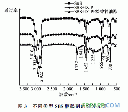 圖3示出了采用美國力高尼670型紅外光譜儀測定的SBS、SBS+DCP以及SBS+DCP+松香甘油酯三種膠黏劑固化后的紅外光譜。紅外光譜中3 010cm-1處的吸收峰是苯環C― H 伸縮振動峰;3 005cm-1處的吸收峰是丁二烯C― H 鍵的伸縮振動峰;2 922cm-1處的吸收峰是飽和C― H 鍵的伸縮振動峰;1 732cm-1處的吸收峰是松香甘油酯中C=O 伸縮振動峰;1 641cm-1 處的吸收峰是C=C雙鍵的伸縮振動峰;1 452cm-1處的吸收峰是飽和C― H 鍵的變形振動吸收峰;1 235cm-1處的吸收峰是松香甘油酯結構中乙烯基醚=C― O 的伸縮振動峰;966cm-1處的吸收峰是反式二取代乙烯C― H 鍵的變形振動吸收峰;911cm-1處的吸收峰是亞乙烯基C― H 的變形振動吸收峰;760cm-1和700cm-1處的吸收峰是苯環上C― H 的變形振動吸收峰。從圖3中可以看出,經過DCP固化的SBS膠黏劑在3 005cm-1處的吸收強度大大減弱,同樣加入松香甘油酯后的SBS膠黏劑經過DCP固化也呈現出同樣的變化;而且SBS膠黏劑和加入松香甘油酯后的SBS膠黏劑在經過DCP 固化后,1 641cm-1處的C=C雙鍵的伸縮振動峰也變得很微弱;同時兩者在966cm-1處和911cm-1處的吸收峰也比未經DCP固化的SBS有所減弱。我們分析這是因為DCP打開了SBS的C=C雙鍵,發生交聯固化,使SBS中的雙鍵減少。從圖3還可以看出,加入松香甘油酯的SBS 經DCP 固化后,在1 235cm-1出現一處吸收峰,為乙烯基醚的伸縮振動峰,可能是松香甘油酯中雙鍵上的H 在DCP的作用下被取代,并通過醚鍵與其它鏈段發生交聯;由于松香甘油酯含有大量酯基以及少量羧基,因此加入松香甘油酯的SBS經DCP固化后紅外光譜中含有C=O伸縮振動峰[12]。