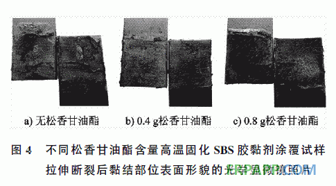 圖4示出了采用日本佳能公司IXUS-125HS數碼相機觀察的不同松香甘油酯含量高溫固化SBS膠黏劑涂覆試樣的拉伸斷裂后黏結部位表面形貌的光學顯微鏡照片。從圖中可以看出,不含松香甘油酯SBS膠黏劑涂覆試樣在拉伸剪切破壞后,因SBS膠黏劑剪切強度較低,表現為膠黏劑與聚乙烯基體發生大面積剝離,黏結界面破壞;隨著SBS膠黏劑中松香甘油酯含量的增加,在松香甘油酯的增黏及交聯固化的雙重作用下,SBS膠黏劑的剪切強度相應提高,涂覆試樣在拉伸剪切破壞后,主要表現為混合破壞,即發生黏結界面破壞和膠黏劑本身破壞(即內聚破壞)。