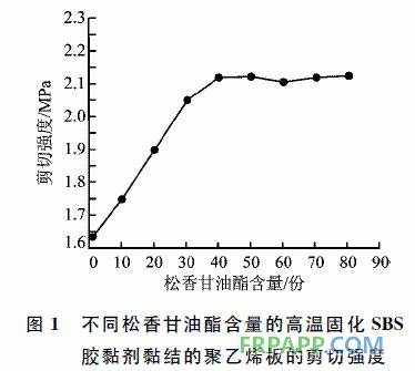 SBS中含有大量雙鍵,向其中加入DCP作為固化劑,使其形成三維網狀結構,提高黏結劑的強度。向膠黏劑中加入增黏的松香甘油酯后,在加熱固化的過程中,部分松香甘油酯會與SBS發生交聯,進一步提高膠黏劑的強度。松香甘油酯的用量為40份時,剪切強度達到最大值,而隨著松香甘油酯的進一步增加,其剝離強度略有下降。進一步完善配方和工藝,熱固化SBS膠黏劑有望用于聚乙烯電纜料的修補以及防水卷材的黏結,并具有較好的工業前景。