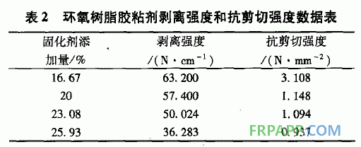 其次,研究了固化劑添加量對力學性能的影響。選取聚氨酯的用量為16.67%固化劑用量變化的一組數(shù)據(jù),測量了膠粘劑的剝離強度和抗剪切強度,測量數(shù)據(jù)如表2所示。膠粘劑的抗剪切強度(拉伸剪切強度)按照GB7124-1986(膠粘劑拉伸剪切強度測定方法(金屬對金屬)》進行測試,剝離強度按照GB/T2790-1995《膠粘劑180°剝離強度試驗方法撓性材料對剛性材料》進行測量[6]。
