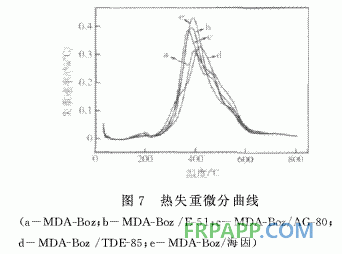 2.5.2 混合樹脂固化物的熱失重速率分析從圖7熱失重微分曲線看出,聚苯并噁嗪和苯并噁嗪/環氧混合樹脂固化物均出現一個熱失重速率最大的主峰,其峰頂溫度分別為394℃(MDA-Boz)、383℃(MDA-Boz/E-51)、369℃(MDA-Boz/AG-80)、416℃(MDA-Boz/TDE-85)和390℃(MDA-Boz/海因),另外部分樹脂體系在460℃附近有一個強度較小的肩峰。由于化學結構不同,分解機理也有差異,MDA-Boz/E-51、MDA-Boz/AG-80和MDA-Boz/海因3個混合樹脂的最大熱失重速率(對應于主峰的峰高)明顯高于聚苯并噁嗪;雖然MDA-Boz/TDE-85體系的最大熱失重速率與聚苯并噁嗪相當,但是該體系在310℃附近出現一個肩峰;這些結果可以進一步解釋為什么混合樹脂體系的熱穩定性低于聚苯并噁嗪。