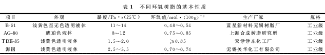 本實驗所用的環氧樹脂為市售產品,包括縮水甘油醚型環氧樹脂(E-51)、縮水甘油胺型環氧樹脂(AG-80)、酯環型環氧樹脂(TDE-85)、特種環氧海因環氧樹脂等4種類型,其基本性質列入表1。