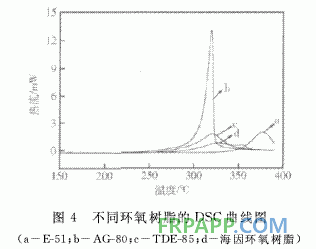 從圖4可以看出,在沒有加入固化劑的情況下,各種環氧樹脂的放熱反應都出現在大約250℃以上,放熱峰頂溫度在300℃以上。其中,AG-80的固化放熱峰溫度較低、放熱反應較為集中、熱焓最大(974.7J/g);E-51的放熱峰溫度最高,達到376℃;而海因環氧的放熱峰較平坦、熱焓最小(248J/g)。上述差異與各種環氧樹脂的結構有關。