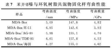 2.6 苯并噁嗪/環氧樹脂共聚物澆鑄體的力學性能表7為苯并噁嗪與環氧樹脂混合物固化彎曲強度。從表7可以看出,混合樹脂體系固化物的彎曲模量比聚苯并噁嗪樹脂的彎曲模量均有不同程度的下降,顯示出與動態力學測試中室溫儲能模量的相同結果。說明加入環氧樹脂以后,混合樹脂固化產物的剛性下降了。其中,MDA-Boz/E-51體系的模量最低,降至3.92GPa。