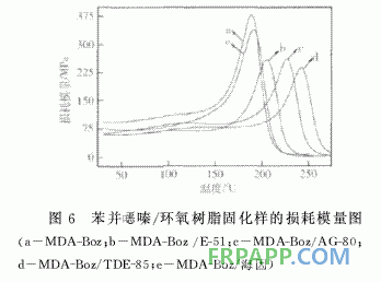 圖6是苯并噁嗪與不同環氧樹脂混合后固化物的損耗模量圖,由E”所表征的Tg分別是:197.3℃(MDA-Boz)、203.9℃(MDA-Boz/E-51)、225.0℃(MDA-Boz/AG-80)、241.1℃(MDA-Boz/TDE-85)、190.8℃(MDA-Boz/海因)。可以看出,不同的環氧樹脂加入到苯并噁嗪樹脂基體中,固化物的Tg相比聚苯并噁嗪有不同改變。AG-80為多官能環氧,TDE-85中除了有兩個縮水甘油酯型環氧基團,還有一個直接連在環上的脂環族的環氧基,它們分子鏈上可供反應的交聯點多,導致混合樹脂體系的化學交聯密度明顯增加,Tg升高。而E-51和海因環氧樹脂均為雙官能環氧基,交聯密度較低,對Tg變化的影響較小。