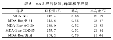 損耗因子tanδ值是粘性組分與彈性組分的比率,tanδ的峰高與交聯密度有關。表5列出了各體系的tanδ峰的位置、峰高、半高寬,從中可以看出,除了MDA-Boz/海因混合樹脂固化物,其它幾種混合樹脂固化物較聚苯并噁嗪的tanδ峰高均有不同程度的降低。這是由于加入環氧樹脂以后,環氧基與苯并噁嗪開環形成的酚羥基反應,聚合物鏈段運動能力降低,由此即表明苯并噁嗪與環氧共混樹脂固化物較聚苯并噁嗪具有更高的交聯密度。