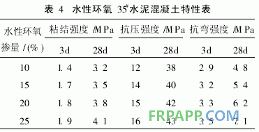 其原因是:水性環(huán)氧樹脂膠液是在高溫下將 普通的環(huán)氧樹脂乳化,使環(huán)氧樹脂以顆?;蚰z體 的形式分散于以水為介質(zhì)的乳液中。使用前需在 膠液中摻入一定量的固化劑,將水中的環(huán)氧樹脂 固化,析出膠液中的水分。因此固化劑的粘聚性 和析水能力很大程度上影響著水性環(huán)氧樹脂膠液 的強度。在試驗中選取的是651胺類固化劑,之所 以出現(xiàn)后期強度提高不大的情況,關鍵在于該類 固化劑沒有將水性環(huán)氧樹脂膠液中的水全部析 出,導致混凝土中殘留少量的水分,增大了水灰 比,影響了后期強度。