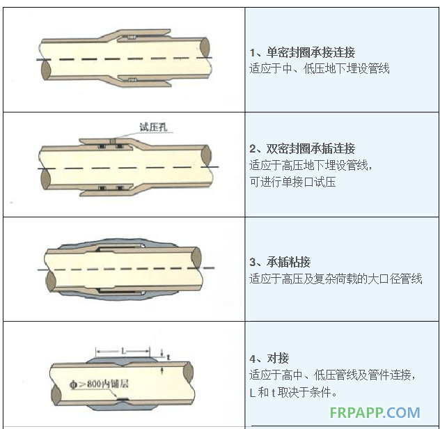 玻璃鋼管常用的連接方式有四種:對接式連接、承插式膠接、法蘭連接和承插式密封圈連接。密封圈連接分單O型圈連接、雙O型圈連接。前兩種方法多用于管道與管道之間的固定連接,法蘭連接用于經(jīng)常拆卸的部位,而密封圈連接則多用于地下管道之間的連接對接式連接接法適于大口徑管彎曲部位的連接及現(xiàn)場補修;承插膠接法適于定長管的連接(但有耐腐蝕層管不能用);管道與泵連接,由于會產(chǎn)生振動,應用柔性接頭以減少管道及管件部位的變形。玻璃鋼夾砂管道多采用雙O型密封圈連接形式,在管道承口處兩道密封圈之間預留試壓孔,在管道安裝的時候,做到安裝一根,試壓一根,確保接頭無滲漏。