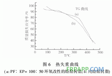 圖6是PF∶EP=100∶50改性的酚醛樹脂和純酚醛樹脂 的熱失重曲線,由圖可看出,除了當(dāng)溫度低于125℃以前由于 失水造成的熱損失a>b外,真正由于溫度升高使有機(jī)物分解 而造成的熱失重始終是環(huán)氧改性過的酚醛樹脂要小于純的酚 醛樹脂,即是說改性過后酚醛樹脂的耐熱性能有所提高。如 在300℃時(shí),該溫度是一般的耐高溫聚合物的使用溫度,從圖 中可看出,曲線(a)的質(zhì)量殘留率為85%左右,而(b)純的酚醛 樹脂在該溫度下的質(zhì)量殘留率已減少至77%左右。