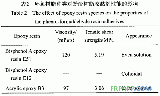 2.2 環(huán)氧樹脂種類的影響 環(huán)氧樹脂種類對酚醛樹脂膠黏劑性能的影響見表2。由表2可知,加入E12改性劑的反應(yīng)溶液內(nèi)有沉淀產(chǎn)生,這說明El2改性劑未能反應(yīng)完全,剩余的單體以沉淀形式存在;而加入E5 1改性劑或B3改性劑的反應(yīng)溶液均勻、無沉淀產(chǎn)生,但E5 l改性劑改性后的酚醛樹脂膠黏劑的拉伸剪切強(qiáng)度更大,改性效果更好。因此,選擇雙酚A型環(huán)氧樹JIBE5 1為改性劑。