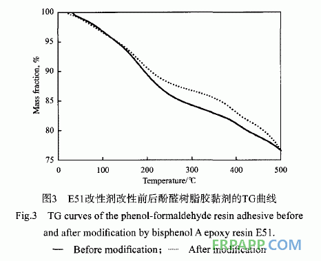 E51改性劑改性前后酚醛樹脂膠黏劑的TG曲線見圖3。從圖3可見,改性后的酚醛樹脂膠黏劑在250,350℃時(shí)的質(zhì)量損失分別為12.0%和14.5%,均低于改性前的質(zhì)量損失(分別為14.0%和17.1%)。由此可見,改性后酚醛樹脂膠黏劑的耐熱性更好。這是因?yàn)榄h(huán)氧樹脂中的環(huán)氧基與酚羥基發(fā)生開環(huán)反應(yīng),減少了縮合水的產(chǎn)生;且未反應(yīng)的酚羥基也可與羥甲基形成氫鍵,增加了分子問力,從而使酚醛樹脂的耐熱性提高。