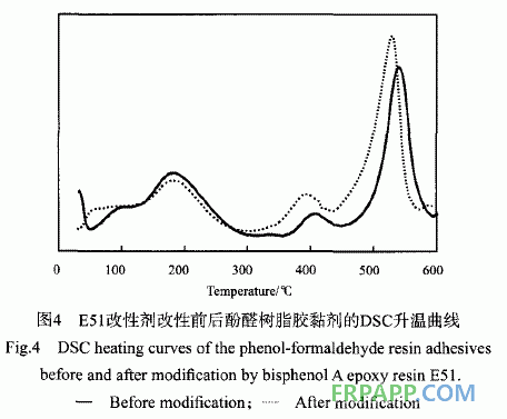 E51改性劑改性前后的酚醛樹脂膠黏劑在80℃下烘干24 h后,在升溫速率20℃/min下測試的DSC曲線見圖4。從圖4可見,未改性的酚醛樹脂膠黏劑的起始固化溫度為185℃,頂峰固化溫度為540℃;改性后的酚醛樹脂膠黏劑的起始固化溫度為178℃ ,頂峰固化溫度為529℃ ,說明改性后的酚醛樹脂膠黏劑的固化溫度有所降低。
