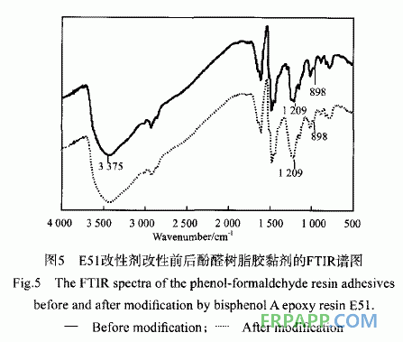 E5 1改性劑改性前后酚醛樹脂膠黏劑的FTIR譜圖見圖5。從圖5可知,3 375 cm 處的特征峰歸屬于酚的O—H鍵的伸縮振動,1 209 cm 處的特征峰歸屬于醚鍵的伸縮振動[11] ,改性后這兩個(gè)峰的高度和寬度明顯高于改性前;898 cm-1處的特征峰歸屬于C一O一C鍵的不對稱面外伸縮振動,改性后該峰的強(qiáng)度明顯減弱,這是因?yàn)榧尤谁h(huán)氧樹脂后,環(huán)氧基開環(huán)與酚醛樹脂的羥甲基發(fā)生縮合反應(yīng),會產(chǎn)生更多的醚鍵,生成大分子,所以改I生后酚醛樹脂的醚鍵特征峰強(qiáng)度強(qiáng)于改性前的酚醛樹脂。