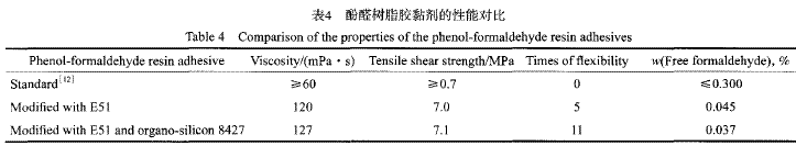 (1)在酚醛樹脂膠黏劑的制備過程中,在回流前加人約1.5%(w)(基于體系質(zhì)量)的雙酚A型環(huán)氧樹脂E51和約0.6%(W)(基于體系質(zhì)量)的有機(jī)硅8427,所得酚醛樹脂膠黏劑的黏度適中、柔韌性較好,游離甲醛含量為0.037%(W),拉伸剪切強(qiáng)度達(dá)到7.1 MPa。