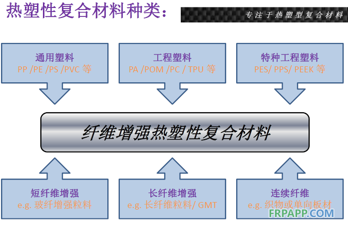 熱塑性復(fù)合材料(FRTP)分為短纖維增強(qiáng)熱塑性塑料(SFRT) / 長(zhǎng)纖維增強(qiáng)熱塑性塑料(LFRT)/ 連續(xù)纖維增強(qiáng)熱塑性復(fù)合材料塑料(CFRT)根據(jù)LUCINTEL 公司市場(chǎng)調(diào)研報(bào)告,2009-2014年的復(fù)合增長(zhǎng)率為5.9%,2014年的銷售額達(dá)到62億美元。預(yù)計(jì)在今后的十年,其發(fā)展速度將達(dá)到8-15%,增速超過(guò)熱固性復(fù)材。