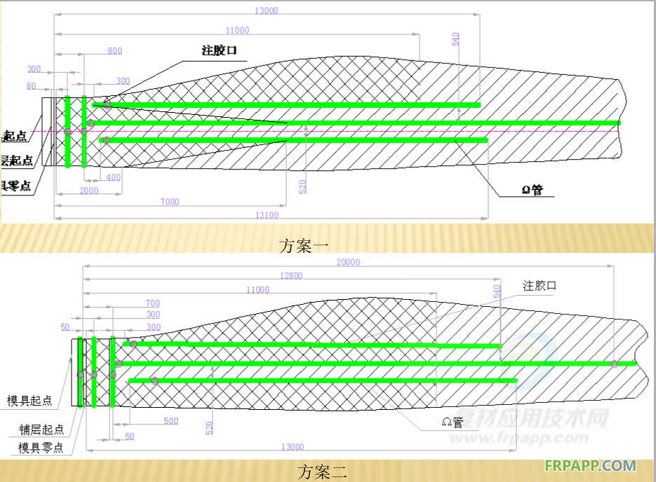 對于復(fù)雜的制件,如葉片,可以根據(jù)制件的形狀和不同部位增強(qiáng)層的厚度,適當(dāng)引入多個樹脂源。(下圖是葉片兩種布管工藝)