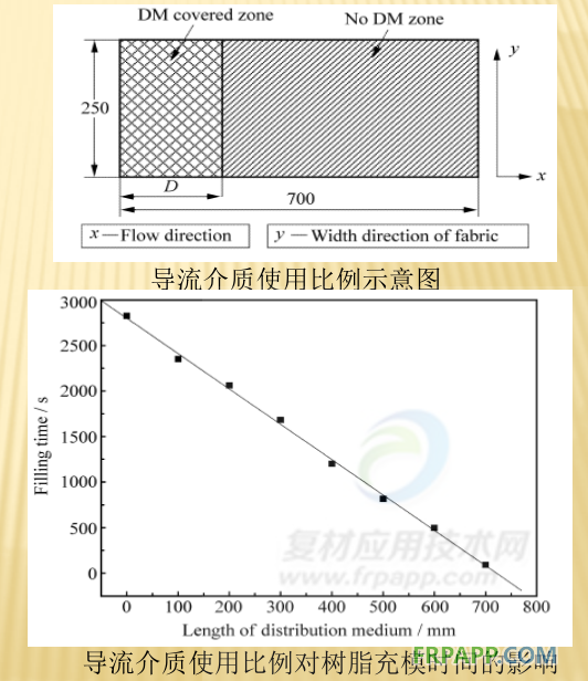 (2)導(dǎo)流介質(zhì)的使用比例對樹脂充模速度的影響 從圖,樹脂的充模時間隨導(dǎo)流介質(zhì)使用比例的增加而呈線性減少,因此在工藝控制時,可以通過改變導(dǎo)流介質(zhì)的使用比例實現(xiàn)對樹脂充模時間和充模過程的控制 。