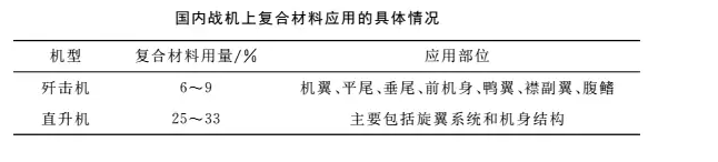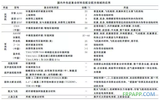 先進復合材料的研究應用主要集中于國防工業(yè)。國內外先進復合材料在航空航天領域的應用情況見表[1]。