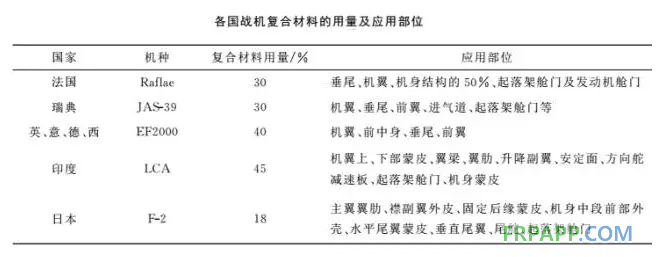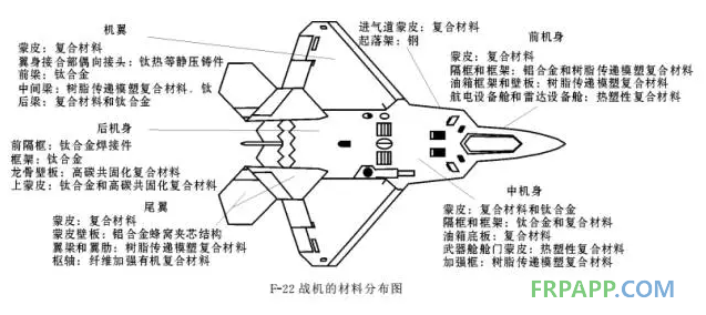 美國在復合材料方面具有強大的、 全面的研究和生產基地,綜合實力最強,是世界上戰(zhàn)機用先進樹脂材料最大的生產國和消費國。在戰(zhàn)機用先進樹脂基復合材料方面,其規(guī)模和技術都走在世界前列。圖為美國戰(zhàn)斗機復合材料使用分布圖。
