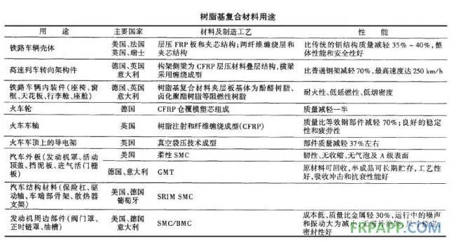 樹脂基復合材料具有質量輕、比強高(節(jié)能),易于加工和改型,耐腐蝕等優(yōu)點,在機車、汽車制造業(yè)獲得了越來越廣泛的用途。樹脂基復合材料在機車和汽車制造業(yè)的用途,材料及制造工藝、性能見表[12]。