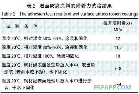 由表2可見:隨著濕度增大,DSF22濕面防腐涂料的附著力只是略有降低;在表面有水的情況下,附著力雖有一些下降,但也能滿足要求;在水中施工時,附著力下降較多,但仍能滿足某些場合的需要。