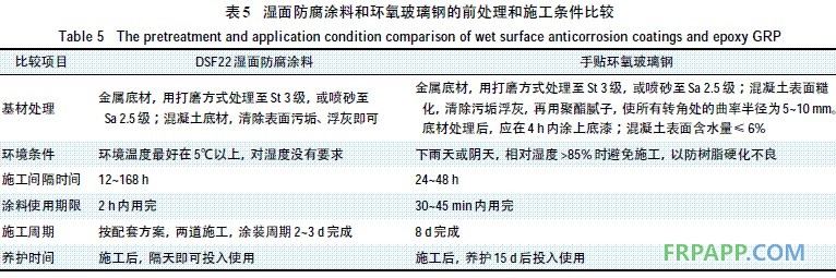 2.5成本核算按3層式環氧玻璃鋼(三布五油),工程單價約為165元/m2;按2道施工,目前DSF22濕面防腐涂料單價為70元/m2,較環氧玻璃鋼成本降低1倍以上。