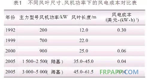 葉片是風(fēng)力機(jī)的關(guān)鍵部件之一,涉及氣動(dòng)、復(fù)合材料結(jié)構(gòu)、工藝等領(lǐng)域。葉片的長(zhǎng)度和風(fēng)機(jī)的功率成正比,風(fēng)機(jī)功率越大,葉片越長(zhǎng)。對(duì)于500kW~ 2.5MW的風(fēng)力機(jī),葉片長(zhǎng)13.5~ 39.0m(丹麥LMGlasfiber公司制造);660kW~1.65MW的風(fēng)力機(jī),葉 片長(zhǎng)23~39m(丹麥VestasWindSystemsAS制造)。在兆瓦級(jí)風(fēng)電機(jī)組中,如1MW的葉片長(zhǎng)31m,每片重約4~5t;1.5MW主力機(jī)型風(fēng)力機(jī)葉片長(zhǎng)34~ 37m,每片重約6t;目前商業(yè)化風(fēng)力發(fā)電所用的電機(jī)容量一般為1.5~2.0MW,與之配套的復(fù)合材料葉片長(zhǎng)度大約32~ 40m,重6~ 8t;現(xiàn)代的54m大型葉片重l3t。現(xiàn)今世界上最大5MW的風(fēng)力發(fā)電機(jī)的葉片長(zhǎng)61.5m,單片葉片的質(zhì)量接近18t,旋轉(zhuǎn)直徑可達(dá)126.3m。 葉片也是風(fēng)機(jī)中成本最高的部件,雖然它的質(zhì)量不到風(fēng)機(jī)質(zhì)量的15%。卻占風(fēng)機(jī)成本的15%~ 20%。風(fēng)葉類(lèi)似于航空葉片,要求提高“提升比”(Lift-to-dragratio),并且其提升特性不易受葉片表面污染和粗糙度影響。從結(jié)構(gòu)考慮要求葉片有較厚的葉型。葉片要經(jīng)受20a應(yīng)用,以經(jīng)受風(fēng)力造成的疲勞次數(shù)達(dá)108(也有以500萬(wàn)次作標(biāo)準(zhǔn))作標(biāo)準(zhǔn)。隨著風(fēng)機(jī)功率的增加,風(fēng)葉尺寸也相應(yīng)增加。表1所示為不同年份風(fēng)機(jī)功率、風(fēng)葉尺寸和風(fēng)電價(jià)格的變化趨勢(shì)。