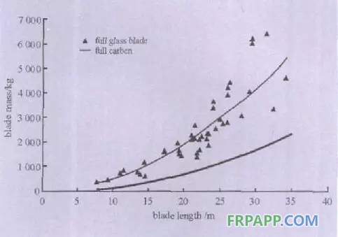當(dāng)葉片長(zhǎng)度增加時(shí),質(zhì)量的增加要快于能量的提 取,因?yàn)橘|(zhì)量的增加和風(fēng)葉長(zhǎng)度的立方成正比(圖1),而風(fēng)機(jī)產(chǎn)生的電能和風(fēng)葉長(zhǎng)度的平方成正比。同時(shí)隨著葉片長(zhǎng)度的增加,對(duì)增強(qiáng)材料的強(qiáng)度和剛度等性能提出了新的要求,玻璃纖維在大型復(fù)合材料葉片制造中逐漸顯現(xiàn)出性能方面的不足。為了保證在極端風(fēng)載下葉尖不碰塔架,葉片必須具有足夠的剛度。減輕葉片的質(zhì)量,又要滿足強(qiáng)度與剛度要求,有效的辦法是采用碳纖維增強(qiáng)。國(guó)外專(zhuān)家認(rèn)為:“由于現(xiàn)有材料不能很好滿足大功率風(fēng)力發(fā)電裝置的需求,玻璃纖維復(fù)合材料性能已經(jīng)趨于極限,因此,在發(fā)展更大功率風(fēng)力發(fā)電裝置和更長(zhǎng)轉(zhuǎn)子葉片時(shí),采用性能更好的碳纖維復(fù)合材料勢(shì)在必行。”他們認(rèn)為當(dāng)風(fēng)力機(jī)超過(guò)3MW、葉片長(zhǎng)度超過(guò)40m時(shí),葉片制造時(shí)采用碳纖維已成為必要的選擇。事實(shí)上,當(dāng)葉片超過(guò)一定尺寸后,碳纖維葉片反而比玻璃纖維葉片便宜,因?yàn)椴牧嫌昧俊趧?dòng)力、運(yùn)輸和安裝成本等都下降了。