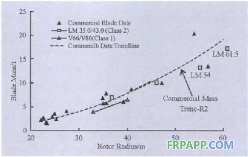 圖1 商業(yè)葉片質(zhì)量與旋轉(zhuǎn)半徑之間的變化趨勢(shì)