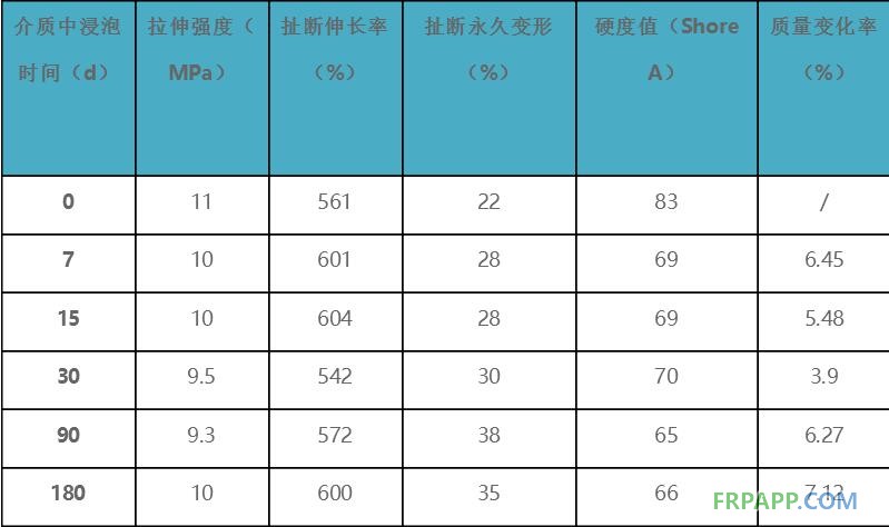 表:新型羧基亞硝基氟橡膠硫化膠在液態N2O4介質中力學性能及質量變化