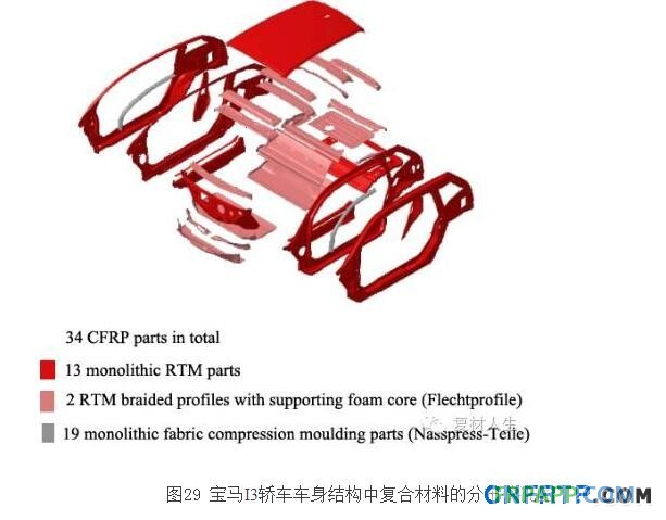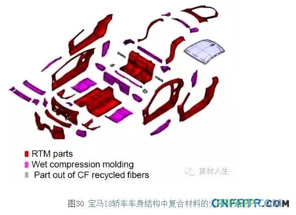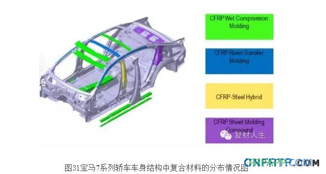 隨著碳纖維制備加工技術的進步,使碳纖維價格大幅度下降,對碳纖維抱有期望的汽車行業看到了希望。德國寶馬純電動汽車I3和I8的問世,更是把復合材料研究的目光吸引到了在I3和I8中大量使用HP-RTM工藝技術上,據寶馬公司的報道顯示,如圖29所示,在i3汽車車身Life模塊結構的34塊碳纖維復合材料制件中,其中有13件采用HP-RTM工藝制造,2件采用泡沫夾芯RTM工藝制造,其余19件采用模壓工藝制造。在I8汽車上也有14件采用RTM工藝制造,如圖30所示。寶馬公司最新的7系列轎車,車身16件復合材料技術中共采用了4種復合材料成型工藝技術,如圖31所示。
