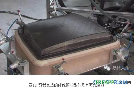 將經過預熱預壓定型的碳纖維增強體轉入預成型體剪裁模具,并用裁剪樣模覆蓋,以裁剪樣模為依據,利用機械手臂將裁刀沿樣模邊緣進行剪裁,切除多余的碳纖維,并獲得與注射模腔尺寸相對應的纖維預成型體。剪裁過程如圖11、12 所示。