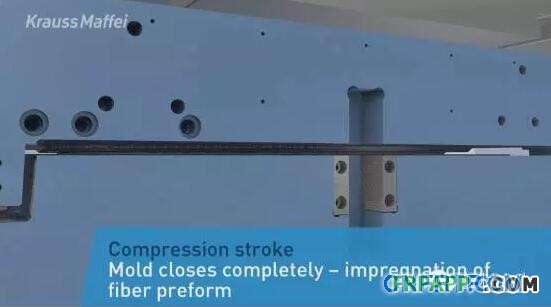 注膠結束后將模具完全閉合,閉合過程中模具進一步擠壓注射樹脂,使其充滿并浸潤碳纖維增強材料,并在高溫高壓作用下快速固化。