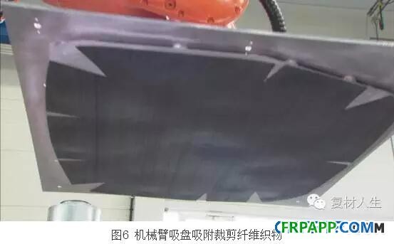 首先將碳纖維織物的卷筒固定在自動裁剪機的旋轉軸上,并將預成型裁剪圖樣輸入自動裁剪,并對裁剪圖樣進行優化排列;展開碳纖維織物卷筒,開動裁剪機,進行預成型體鋪層圖樣的自動裁剪,如圖4所示。并利用機械臂的吸盤將裁剪后的纖維鋪層吸起,并轉移到下一工序設備上,如圖5、6所示。