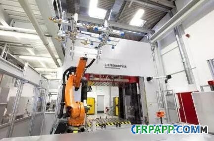 以德國迪芬巴赫公司(Dieffenbacher)和克勞斯瑪菲公司(KraussMaffei)共同開發的高壓樹脂傳遞模塑成型工藝(HP-RTM)自動化生產線(如圖2所示)為實例介紹HP-RTM工藝技術。具體過程如下: